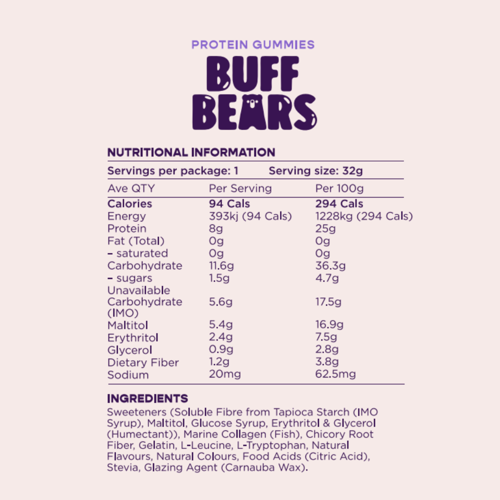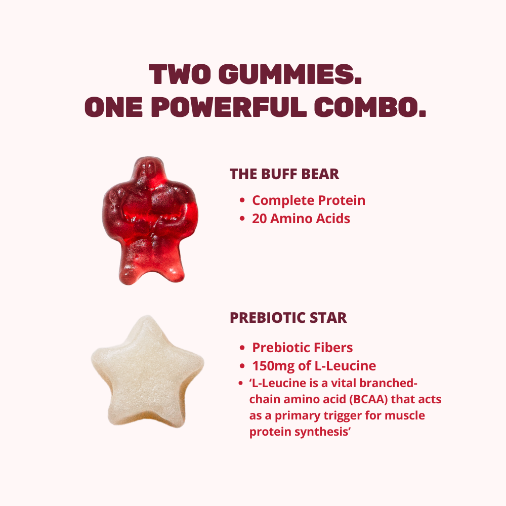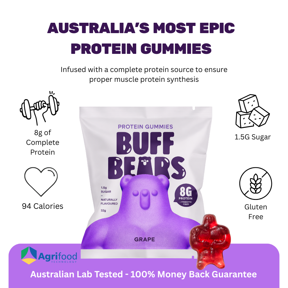 Why Buff Bears? - Buff Bears contain all 9 Essential Amino Acids which is required for muscle building - With added L-Leucine for enhanced muscle protein synthesis!