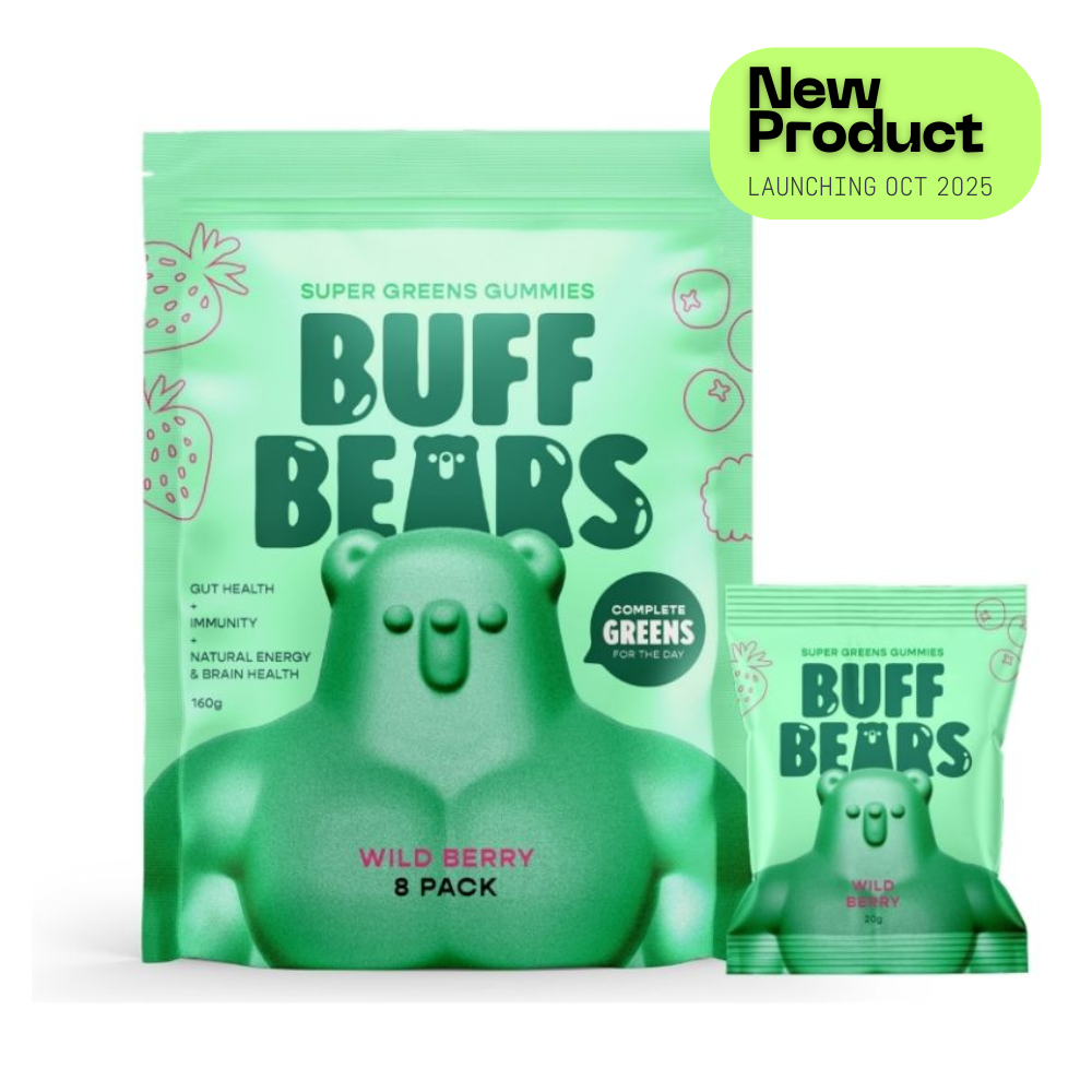 Buff Bears Super Green Gummies are bursting with a potent blend of green superfoods, vitamins, and antioxidants – all in a delicious wild-berry flavour you’ll actually love.